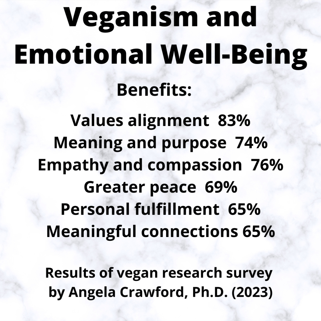 The peace and freedom that I found through living my vegan values is shared by many other vegans. When I surveyed and interviewed vegans for my book, The Vegan Transformation: A Journey to Heal Yourself and the World, I asked how veganism has contributed to their emotional well-being. The most common response was: “Being true to my inner convictions and values.”
